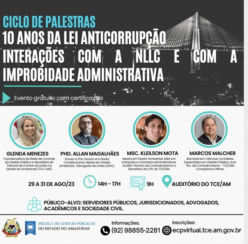 Durante os dias 29, 30 e 31 de agosto, o Tribunal de Contas do Amazonas (TCE-AM), via Escola de Contas Públicas (ECP), realizará um ciclo de palestra para celebrar os 10 anos da Lei Anticorrupção, com interações voltadas para a Nova Lei de Licitações e Contratos (NLLC) e Improbidade Administrativa.